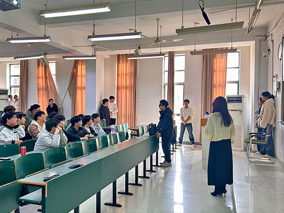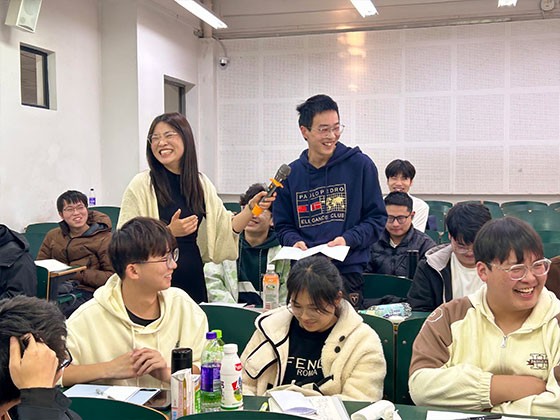 随后,一场充满挑战与协作的互动游戏正式展开。全班被分为两组,每组各选出一名挑战者和十名参与者。参与者随机分散在教室的各个角落,挑战者则需戴上眼罩,在其他同学的语言指挥下,在教室中寻找并触摸到参与者,同时准确说出对方的姓名。最终,正确回答出同学名字数量更多的队伍获胜。游戏过程中,教室里充满了欢声笑语与加油鼓劲的声音。通过这场游戏,同学们不仅加深了彼此之间的熟悉度,更深刻体会到“明确方向”与“团队协作”在达成目标过程中的关键作用——就像挑战者需要依靠同伴的指引才能找到目标,大学生在追求人生目标的道路上,也需要明确的方向和他人的支持。游戏结束后,吴老师邀请同学们分享参与过程中的感受与思考,引导同学们将游戏中的感悟与自身实际情况相结合,思考如何在学习和生活中明确目标、克服困难。